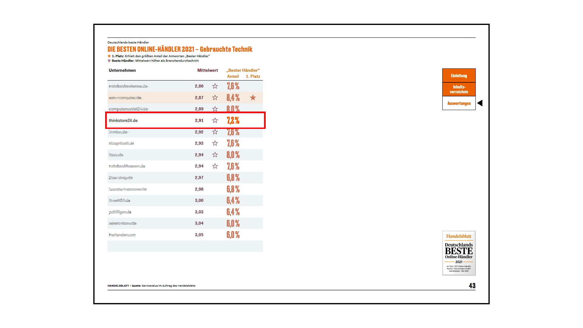 Wir von Thinkstore24.de freuen uns sehr, dass unser Online-Shop in der Kategorie "Gebrauchte Technik" als "Bester Händler" ausgezeichnet wurde. Zu den besten Händlern gehören gemäß der Ranking-Konditionen die Online-Angebote, die von Kunden im Mittel stärker positiv als der Durchschnitt der Branche bewertet wurden.