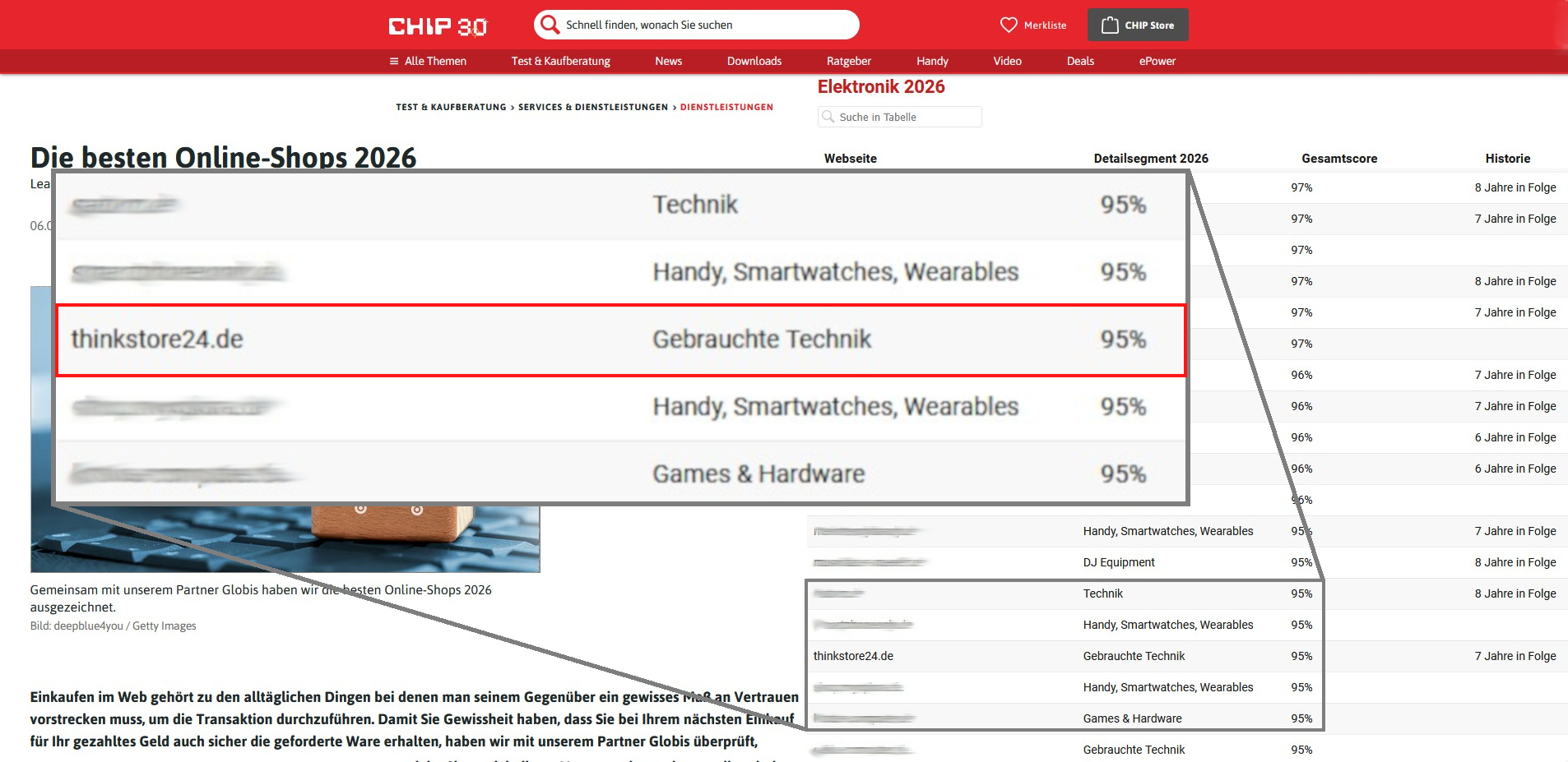 Nur 14% aller untersuchten Webshops konnten sich in allen Kriterien behaupten und wurden als CHIP Leading Shops ausgezeichnet. Wir freuen uns sehr, dass ThinkStore24.de auch zu dieser Zahl gehört – und das bereits zum siebten Mal in Folge!